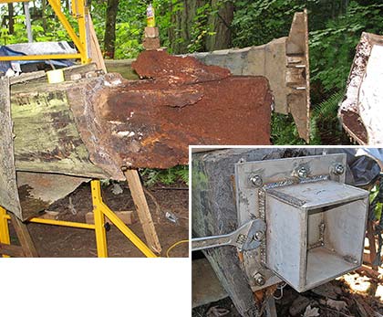 Initial inspection revealed extensive fungal and insect damage in the wood base. The compromised wood was replaced with a stainless steel support. As the sculpture was lifted into place, welders secured the new stainless steel supports. The sculpture was washed and the bronze sections were heated and waxed. The wood was treated with a boric acid to discourage future insect and fungal attack. The sculpture was then sealed to discourage water absorption.